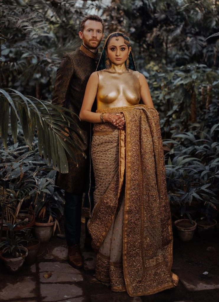 In 2022, Karachi-based designer Misha Japanwala made jaws drop and headlines pop with her daringly bold reception look. Famous for her iconic breastplates, seen on stars like Zendaya, Zoë Kravitz, and Kim Kardashian, Misha went all out by pairing a Rizwan Beyg gold sari with a custom gold breastplate that screamed fearless fashion. While the Rizwan Beyg blouse was a stunner in its own right, it was the sculptural breastplate that brought an extra dose of feminine allure and unapologetic glam to her bridal ensemble. Talk about breaking barriers and serving unforgettable Bridal fashion.