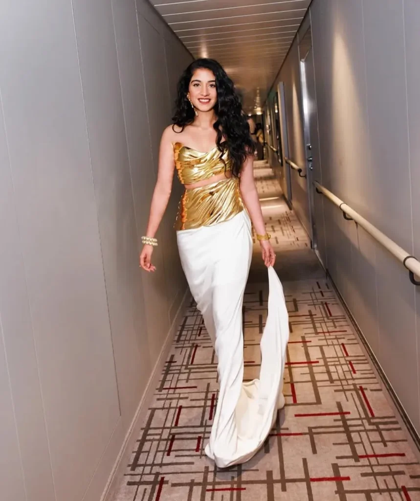 Earlier this year, Radhika Merchant’s pre-wedding celebrations were nothing short of a fashion masterclass, and one look, in particular, made waves—quite literally! For her Mediterranean Sea Toga Party, she donned a show-stopping ensemble featuring a sculpted aluminum bodice paired with a pristine white couture silk skirt, custom-crafted by Graceling. The metal bodice was designed to mimic the ripples of water, perfectly mirroring the Mediterranean’s sparkling waves as the cruise set sail. A futuristic spin on the classic toga, this outfit was nothing short of a high-fashion bridal outfits ode to the sea!